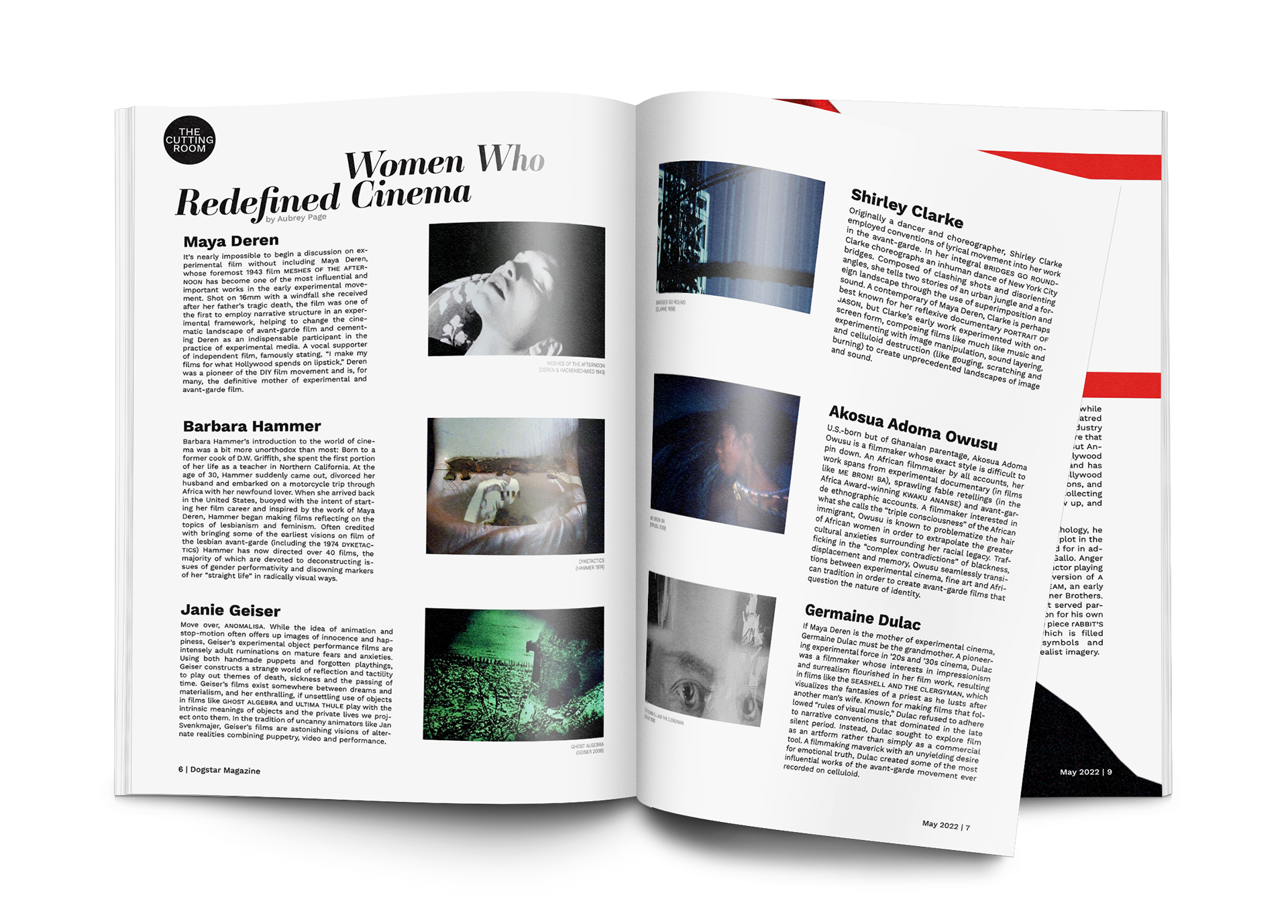 Dogstar Magazine is a publication I created to celebrate the world of avant-garde and experimental film. The cover story on Volume One has an article on Stan Brakhage, and the unorthodox layouts for this story mimic his style of cutting and scratching celluloid to create disorienting effects.