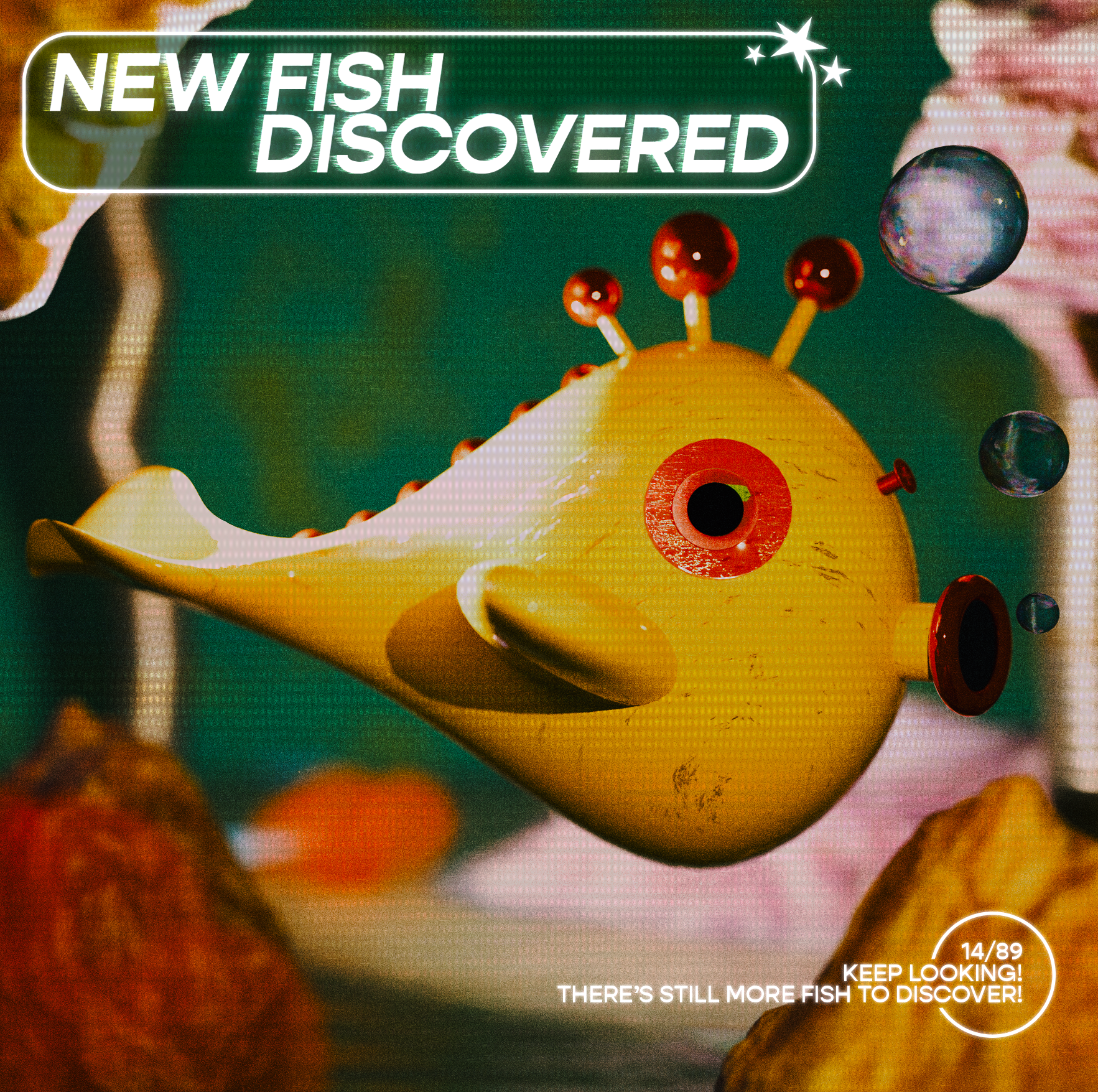 I wanted these fish to look very handmade. Somewhere along the process, it started reminding me of old video game ads, so I decided to style them like they're creatures being unlocked in a video game. Made in Blender with post-processing in Photoshop.