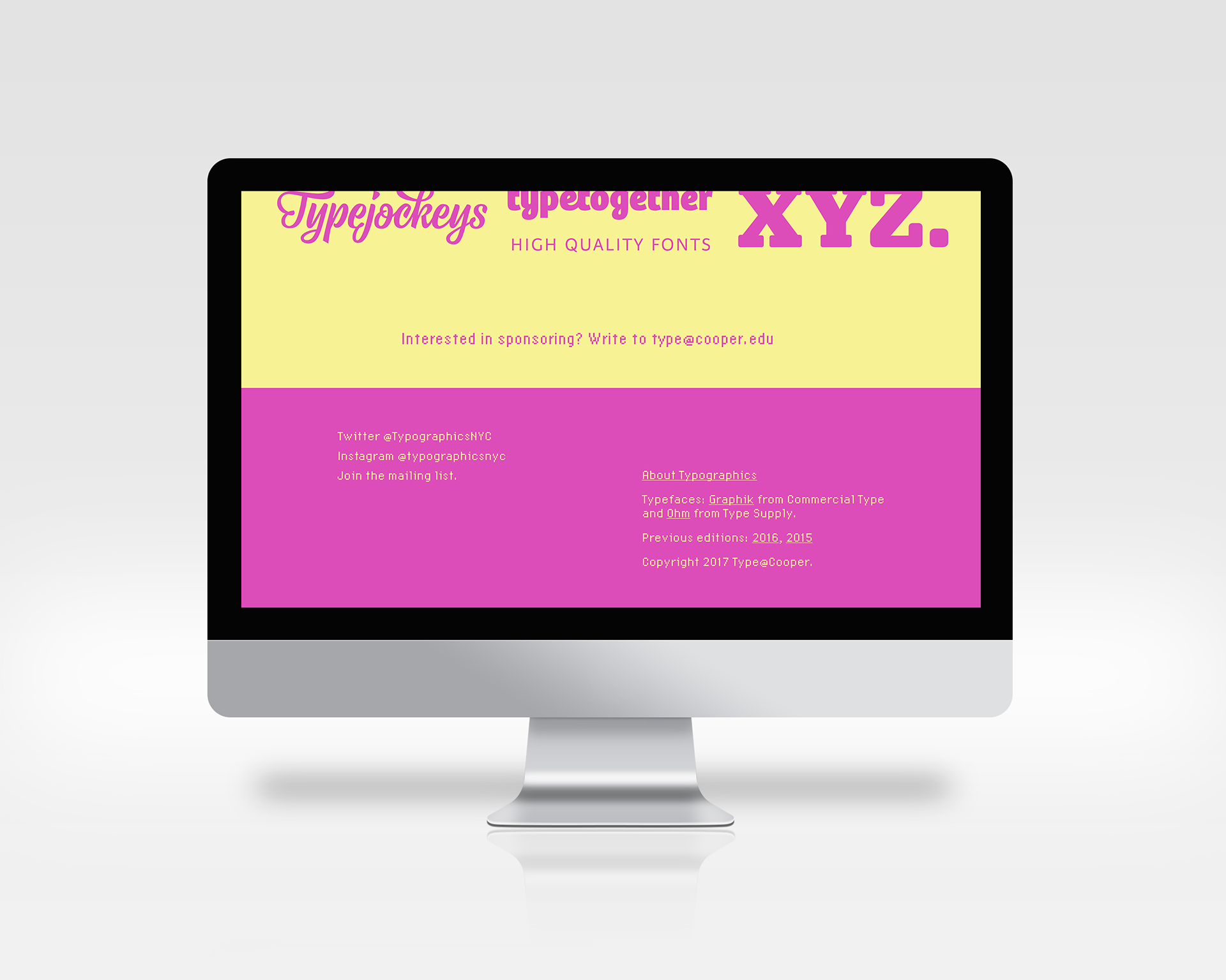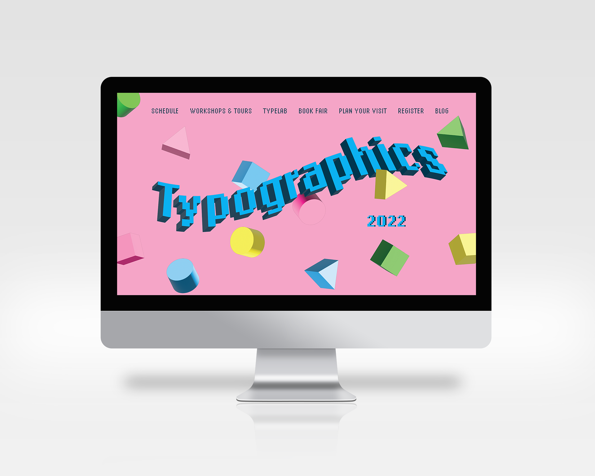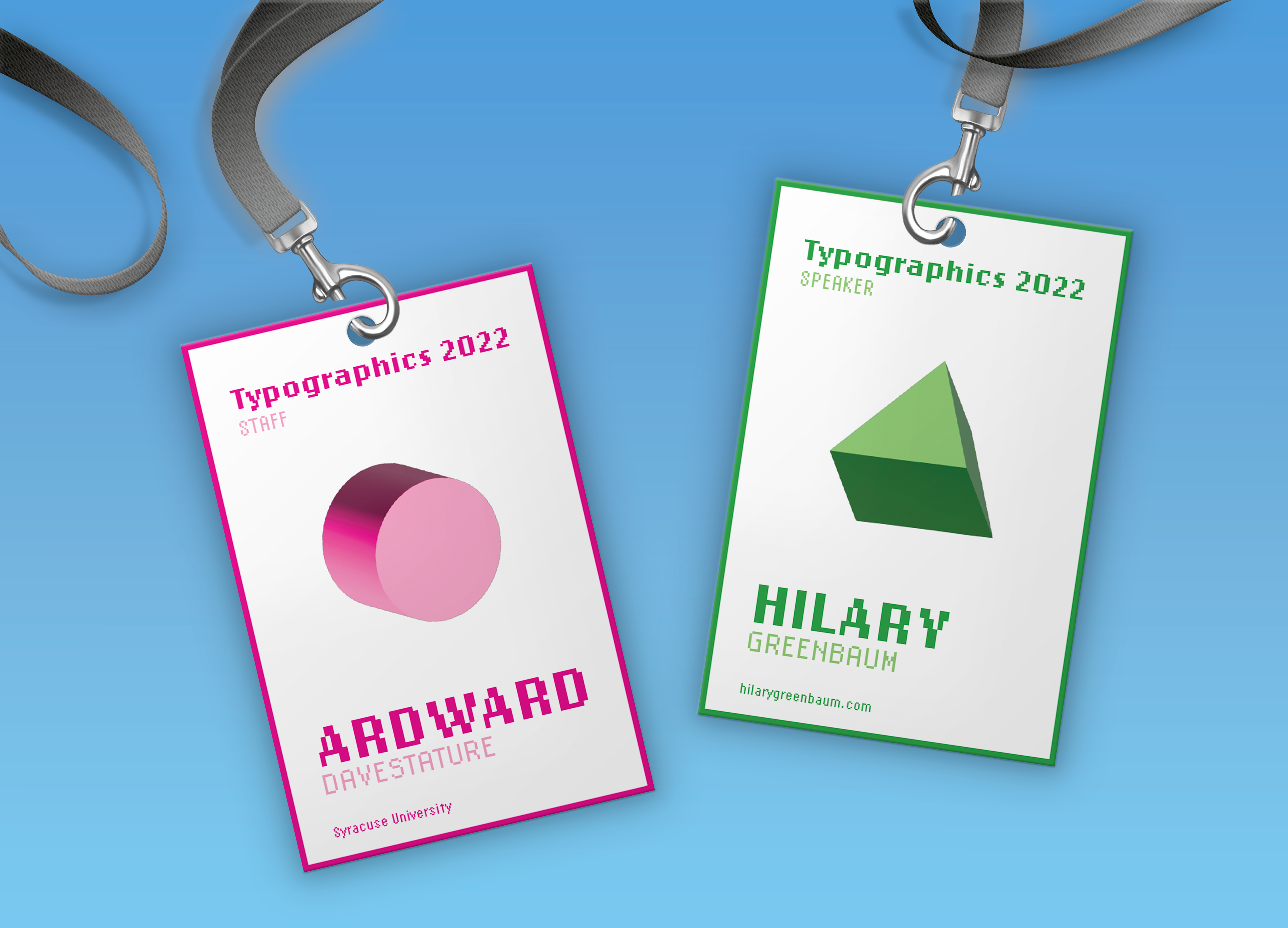 I created a visual identity for the 2022 Typographics conference. As the tagline states, the event is "For people who use type." I started off playing with the idea of web 1.0 aesthetics—pop-ups, warning screens, low resolution graphics, the whole nine yards. But as the project developed, I began to realize that sticking too closely to these nostalgic aesthetics would result in the project looking clunky and unpleasant. So I decided to stick with a few key ideas from the era: garish colors, rudimentary 3-D effects, and a typeface which mimics low-resolution screens of the time.